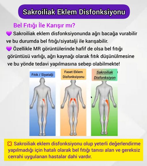 Sakroiliak disfonksiyonunda ağrı bacağa vurabilir ve bu durumda bel fıtığı ile karışabilir.