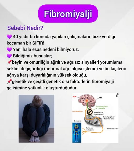 - Bildiğimiz tek şey; beyin ve omuriliğin ağrılı ve ağrısız sinyalleri yorumlama şeklini/işleme biçimini değiştirdiği (anormal ağrı algısı işleme) ve bu kişilerin ağrıya karşı duyarlılığının yüksek olduğudur.