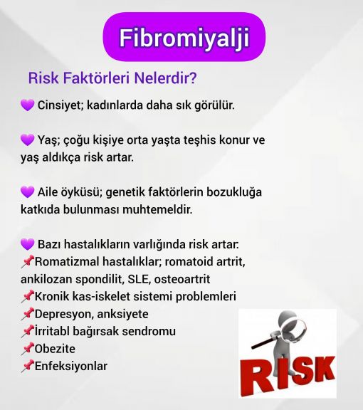 - Cinsiyet; herkeste fibromiyalji gelişebilir, ancak kadınlarda erkeklerden daha yaygındır.