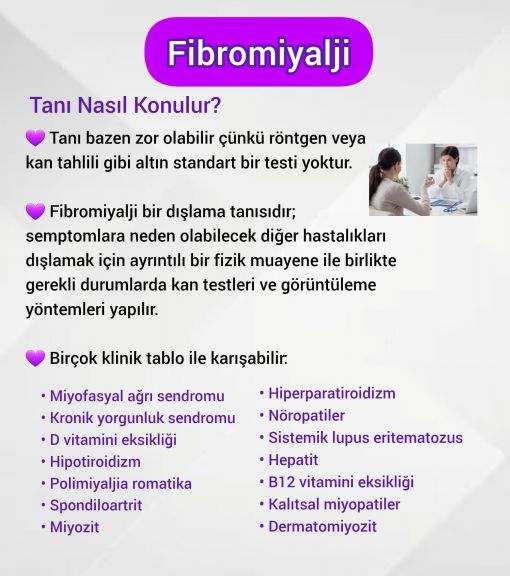 - Fibromiyalji bir dışlama tanısıdır; semptomlara neden olabilecek diğer hastalıkları dışlamak için ayrıntılı bir fizik muayene ile birlikte gerekli durumlarda kan testleri ve görüntüleme yöntemleri yapılır.