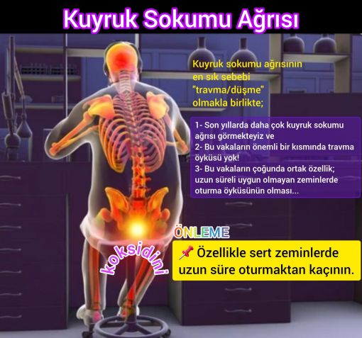 Ağrı oturma pozisyonunda (özellikle düz ve sert yüzeylerde) tetiklenir; kuyruk sokumu ağırlık taşıyan bir yüzeydir, bu nedenle koksidinin en sık görülen belirtisi otururken ortaya çıkan ağrıdır.
