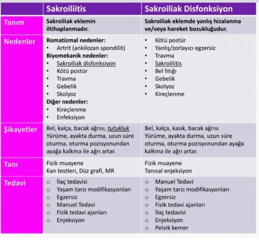 - Sakroiliit ve sakroiliak eklem disfonksiyonu sıklıkla yanlış anlaşılan ve karıştırılan, birlikte veya bağımsız olarak ortaya çıkabilen bel, kalça ve bacak ağrısı ile kendini gösterebilien sakroiliak eklemin iki farklı rahatsızlığıdır.